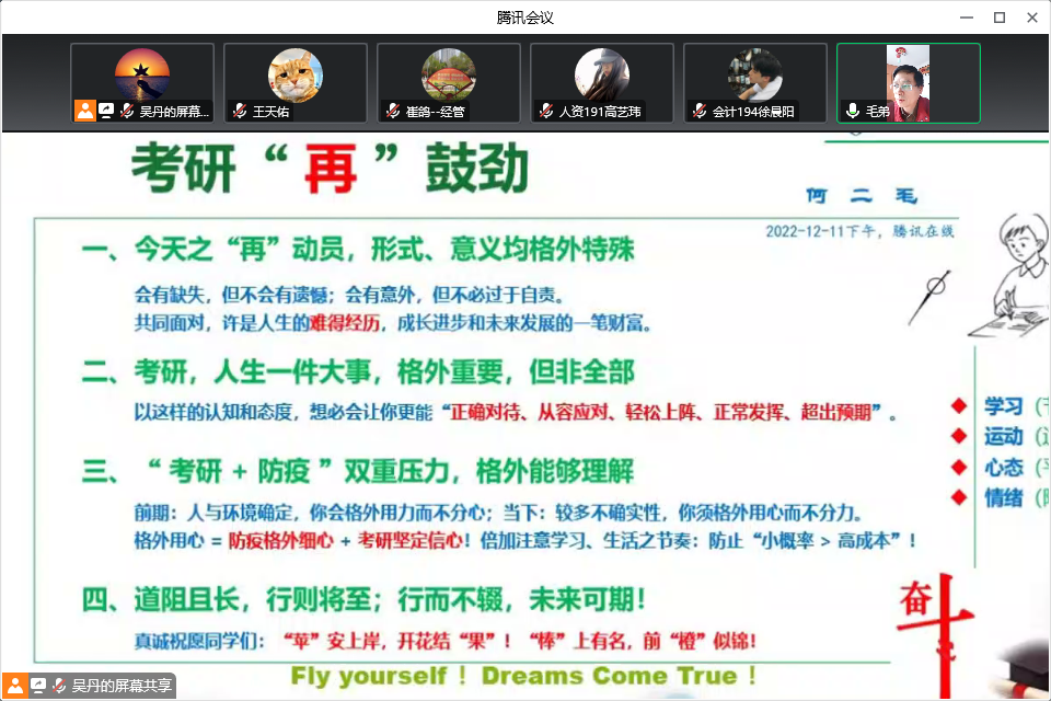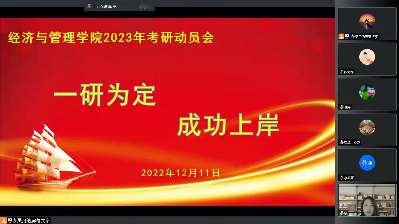 距离2023年全国硕士研究生招生考试不足半个月的时间,为了缓解同学们的压力和焦虑,鼓舞考研士气,12月11日,学院通过线上腾讯会议召开2023年考研动员大会,学院党委书记何二毛,党委副书记吴丹,副院长崔鸽,辅导员陈冬梅、王天佑、常宁宁到会为考研学子加油助力。会议由吴丹主持。