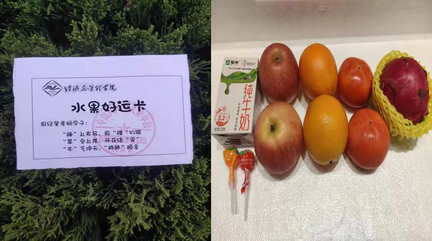 经管学院历来高度重视考研工作,一直把考研工作作为推进学风建设的重要抓手,通过举办考研动员会、考研慰问活动、朋辈经验交流会等方式,积极营造良好的考研氛围,多措并举助力学子考研。今年,学院克服疫情不利因素,多方联系校内超市,为考研学子配送包含牛奶、水果、棒棒糖在内的“好运福袋”!