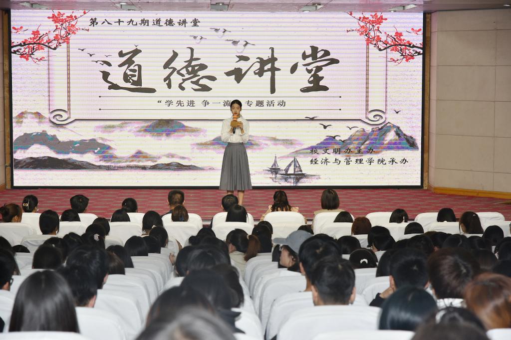 第89期道德讲堂在图教201举行。经管学院党委副书记王彦杰、吴丹,团委书记李可,团委副书记陈冬梅,全体辅导员老师和学生代表300余人参加了活动。