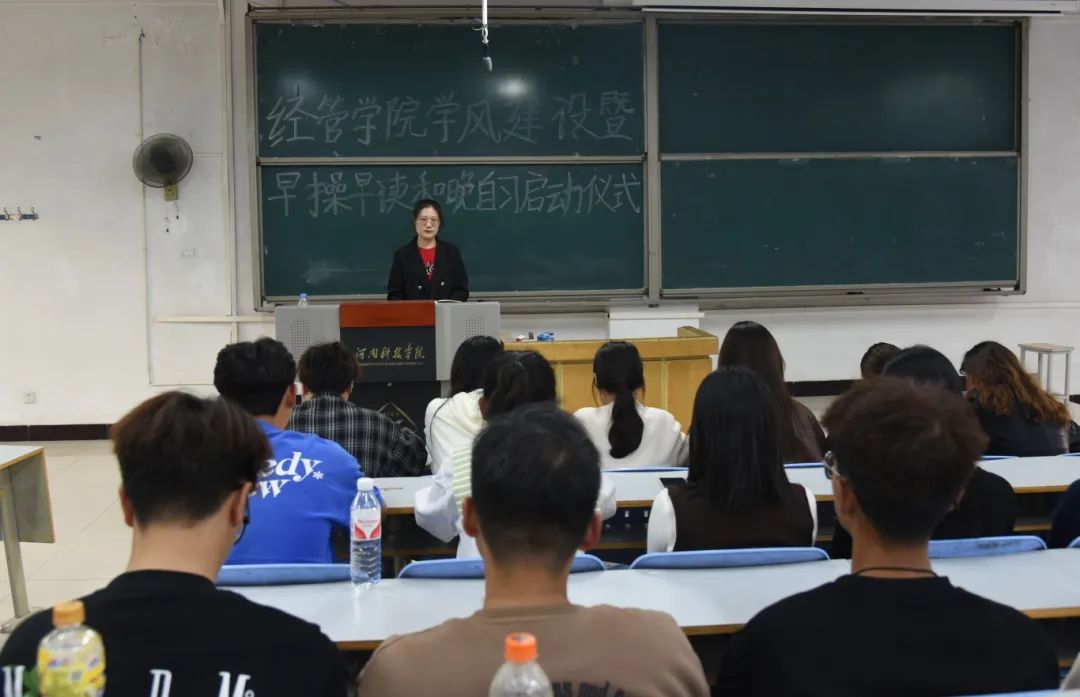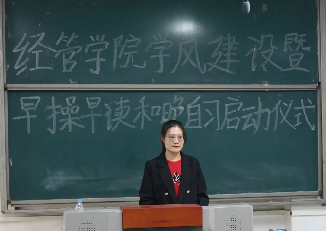 会上,辅导员师瑞丹强调,一日之计在于晨,早操早读作为经管学院的优良传统,不仅能够展现出经管学子们积极向上的精神风貌和勤奋刻苦的学习态度,更是学生们提升学业成绩、增强体质的重要途径,号召全体学生抓住早操早读和晚自习时间,巩固课堂知识,积极锻炼身体,创建美好大学生活。随后,团委学生会学术创新部唐雪茹同学详细介绍了早操早读、晚自习的规章制度和注意事项。