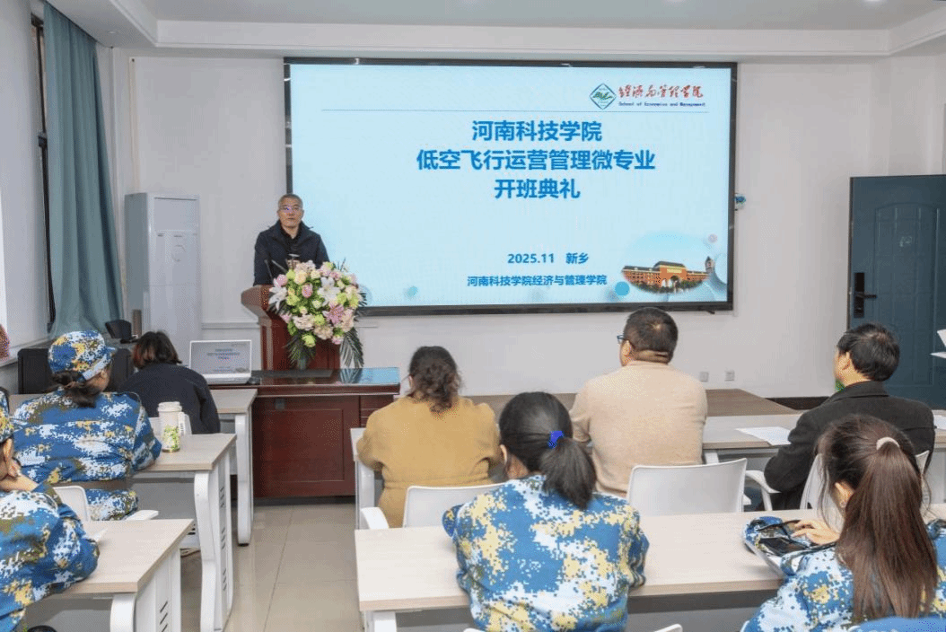 举行低空飞行运营管理微专业开班仪式。这是对接国家低空经济发展战略、深化产教融合、培养新兴领域交叉复合型人才的举措之一。学院党委书记何二毛、副院长翟士军、三维圈数科集团校企合作负责人周函露、市场营销教研室主任王杰芳和首届微专业同学、军训飞行项目表演新生等一同参加仪式。吴国庆老师主持。