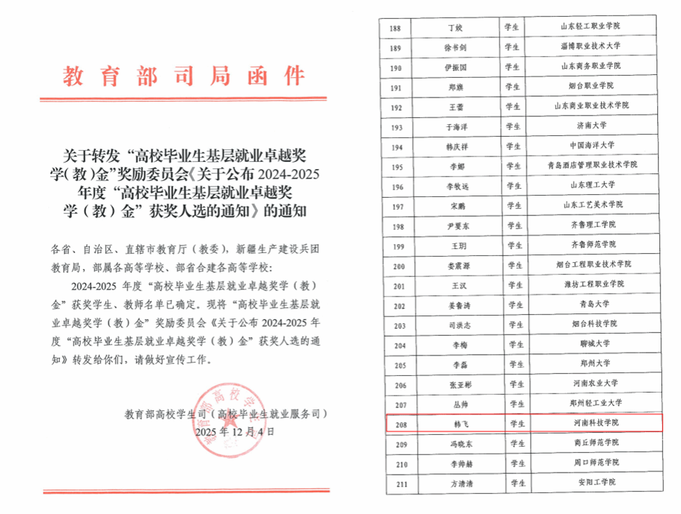 近年来,学院不断强化基层就业导向,通过政策宣讲、典型引路等举措,将服务国家战略与引导学生基层就业深度融合。下一步,学院将以韩飞同学的先进事迹为契机,持续强化育人实效,鼓励更多青年学子扎根基层、逐梦前行,在祖国最需要的地方书写青春华章。