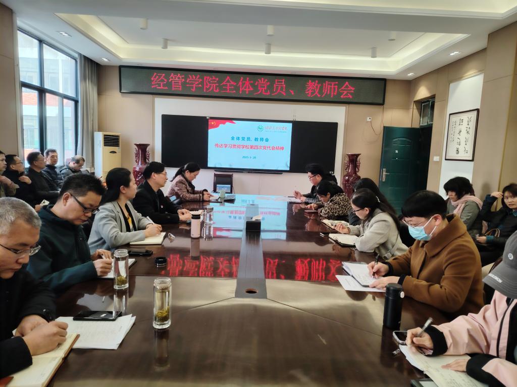 在10号楼202会议室先后召开党委理论中心组专题学习会、全体党员、全体教师会,传达学习贯彻学校第四次党代会精神。学院全体教师参加会议。会议由院党委书记何二毛主持。